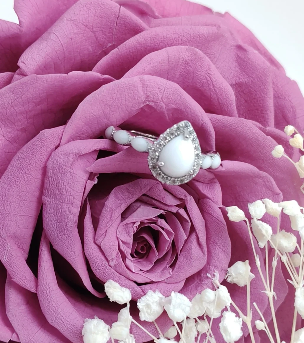 Tout simplement sublime toute ornée de pierre de lait maternel cristallisée, la pierre de lait principale est en forme de goutte et fait 6mmx8mm , une petite pépite parmi nos modèles