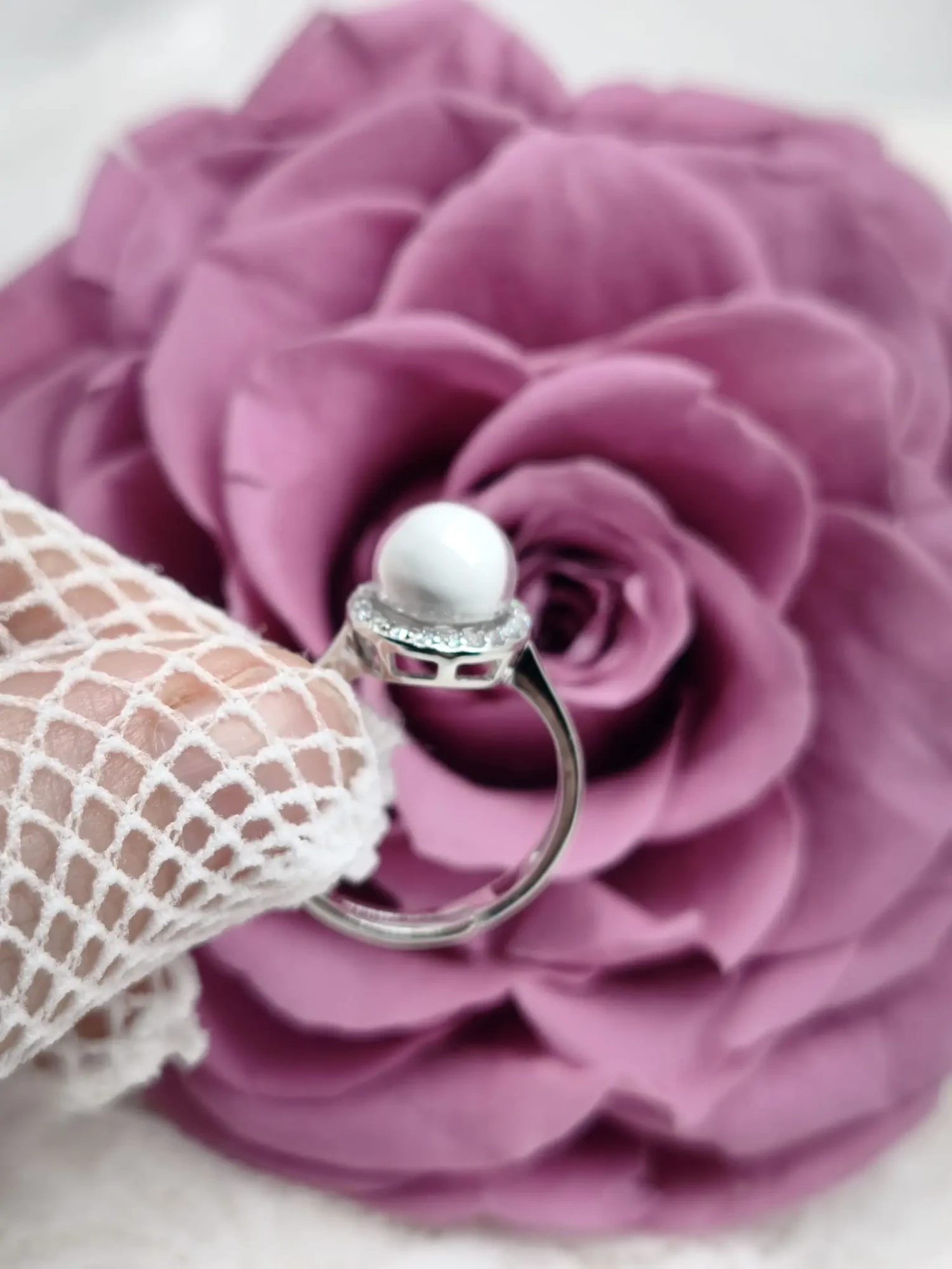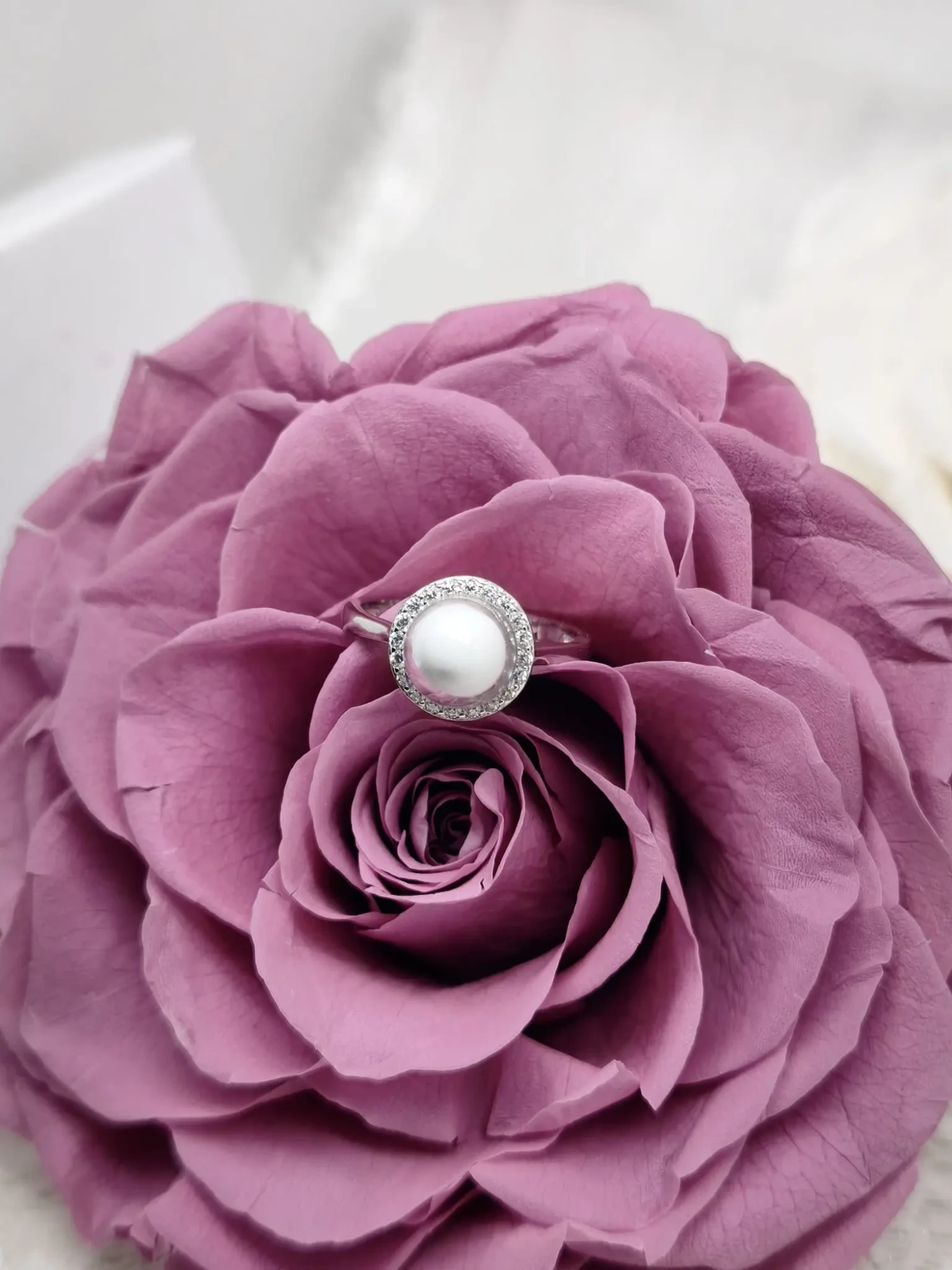 Le cœur de la bague est une perle de 8 mm de diamètre, façonnée à la main uniquement avec votre lait. Elle offre une teinte blanche douce et naturelle, propre à chaque maman. Pour la mettre en valeur, la perle est entourée par un fin halo de petits brillants clairs qui ajoutent une touche lumineuse à l’ensemble.