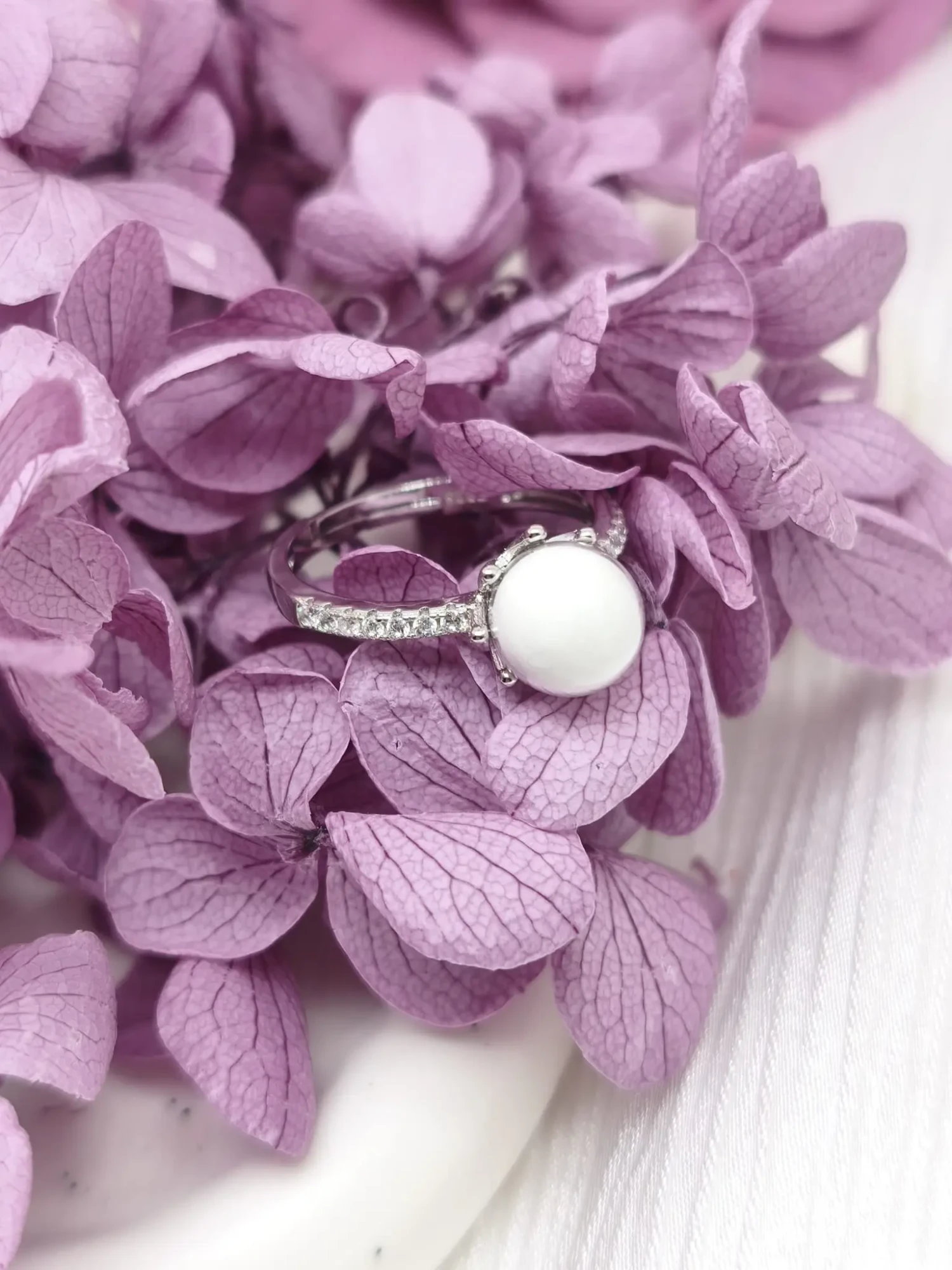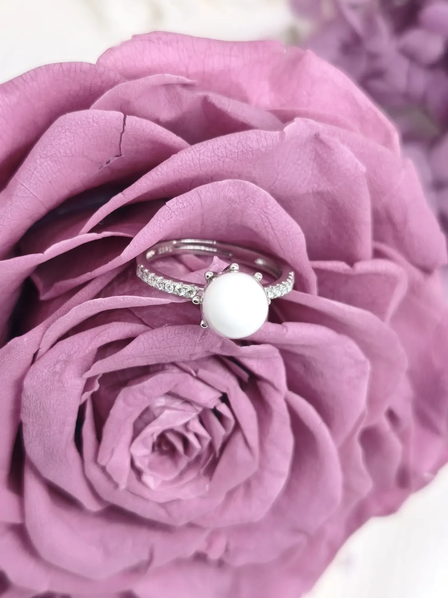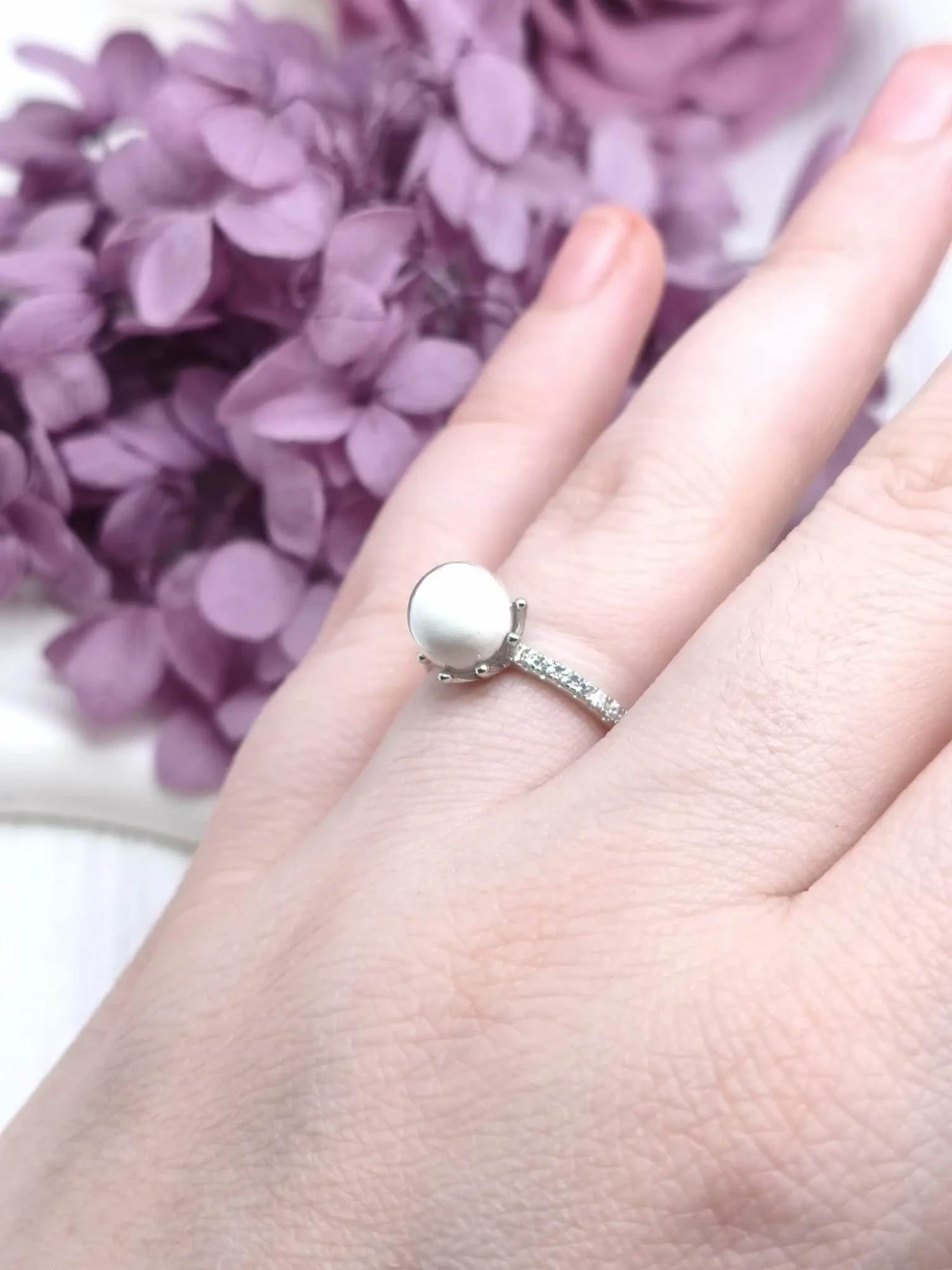 Le cœur de la bague est une perle ronde, façonnée sur mesure avec votre propre lait. Sa finition lisse et son joli blanc naturel mettent en valeur la douceur de ce souvenir unique. La perle est solidement maintenue par quatre griffes métalliques discrètes qui s’inspirent des montures de joaillerie classique.