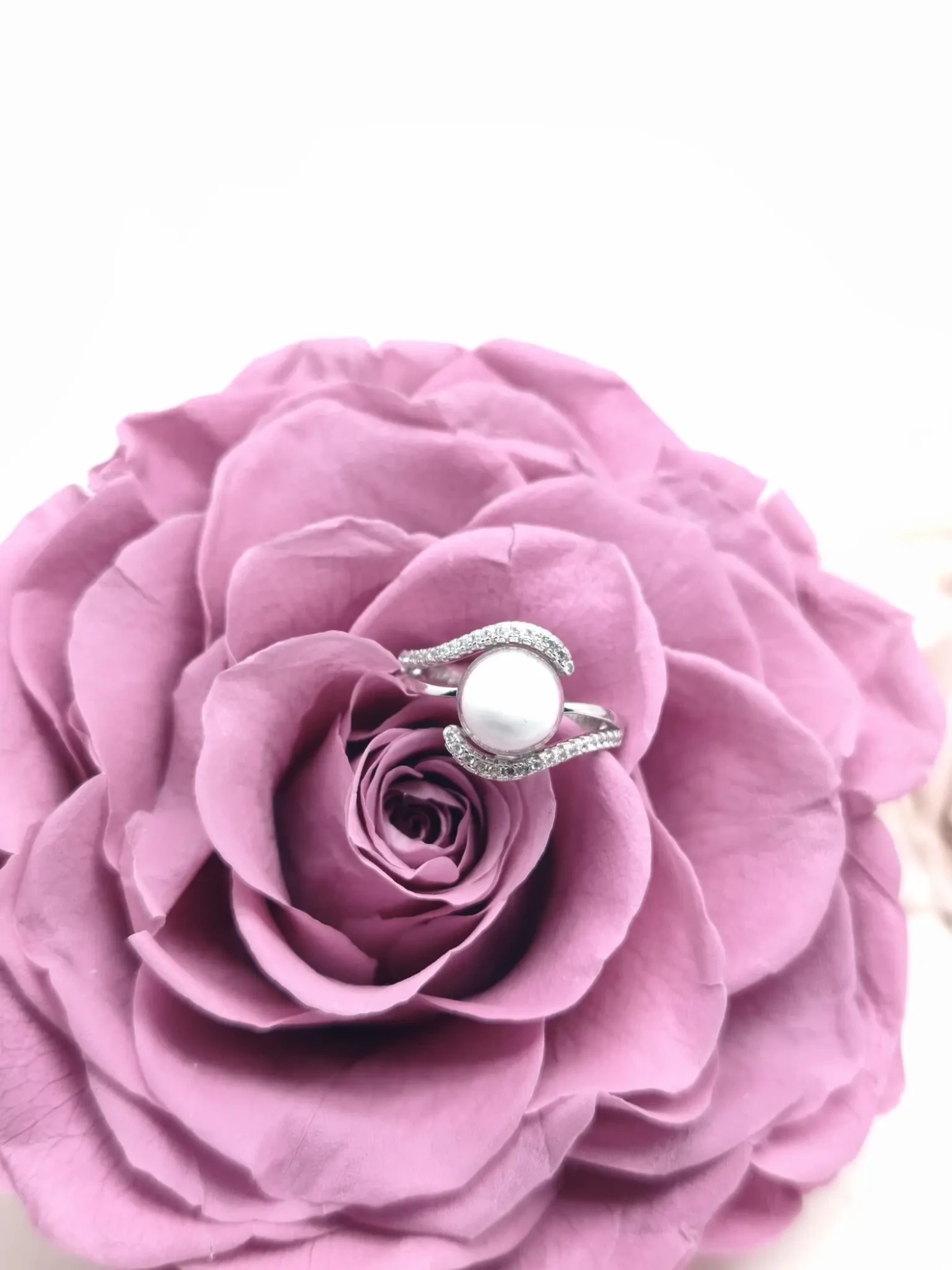 Le corps de la bague est entièrement réalisé en argent 925, une matière classique et résistante adaptée à un usage régulier. L’anneau présente un design fluide : il se sépare pour venir enlacer la perle en douceur par le haut et par le bas. Ces deux jolies courbes sont serties