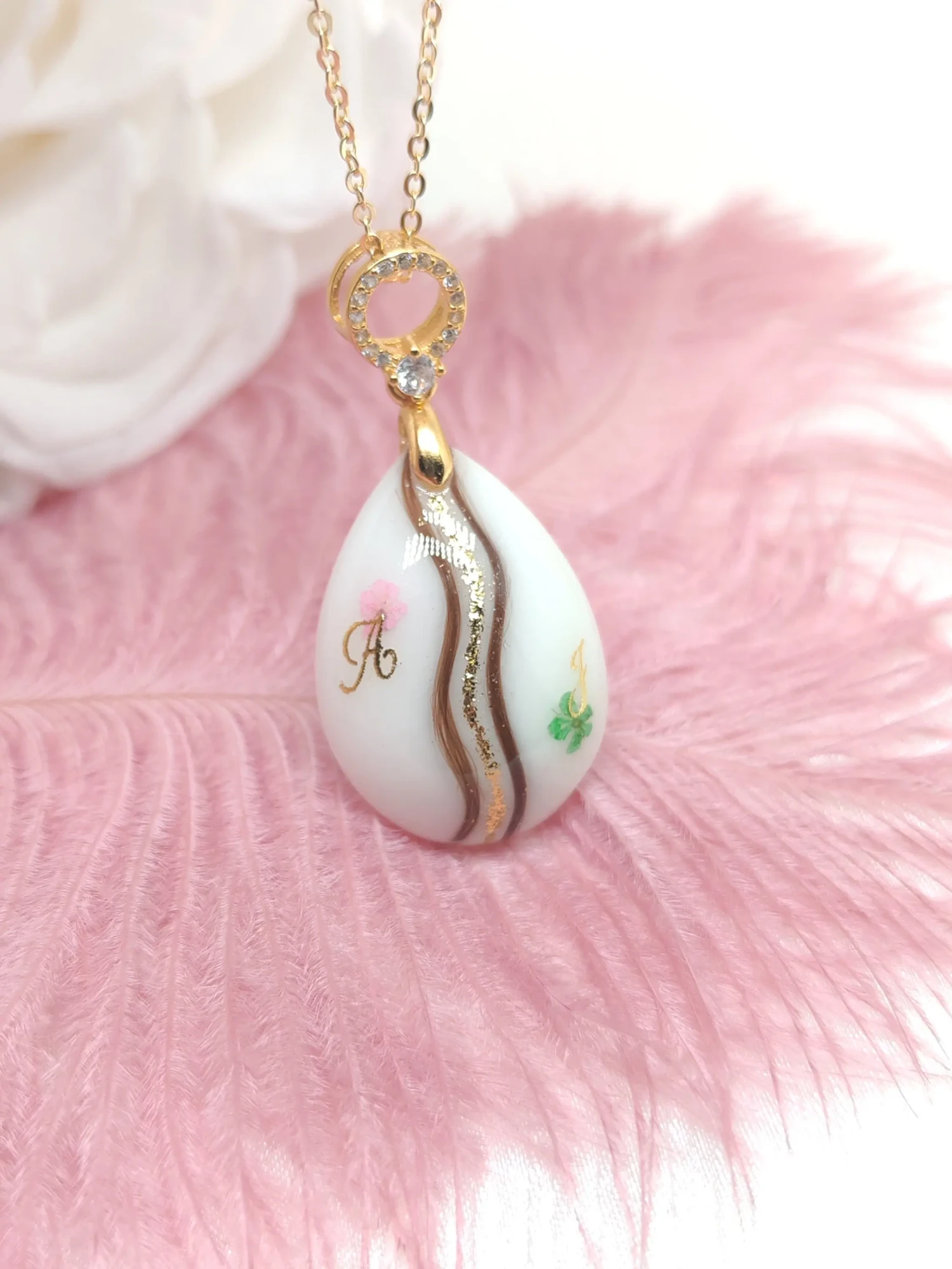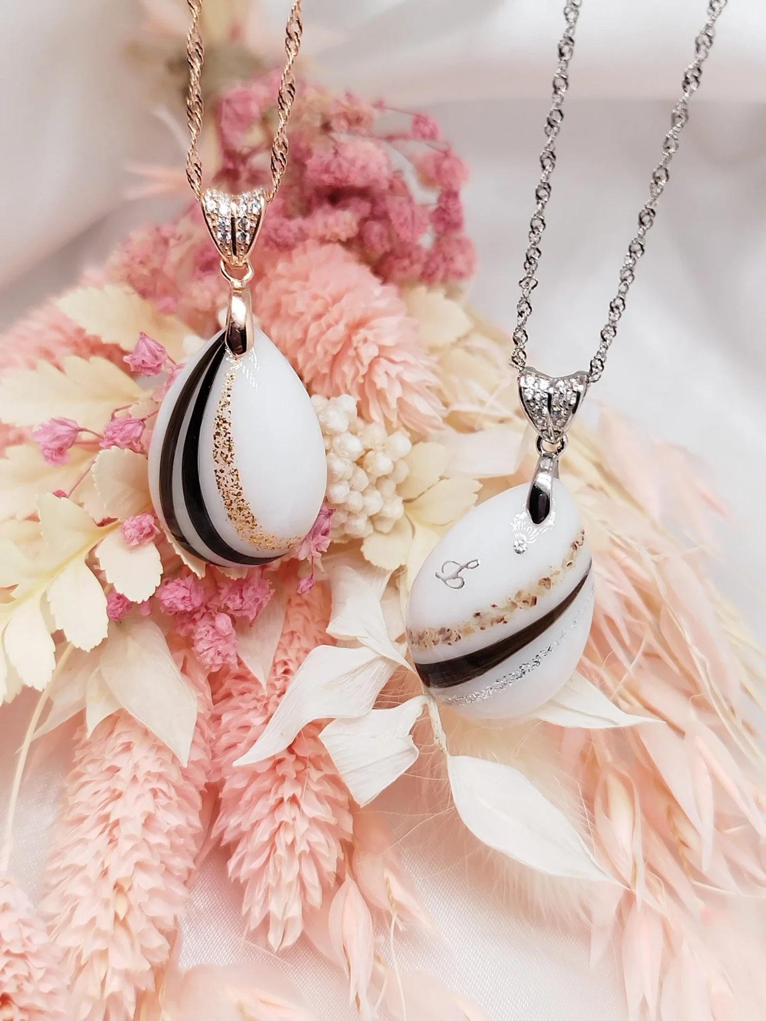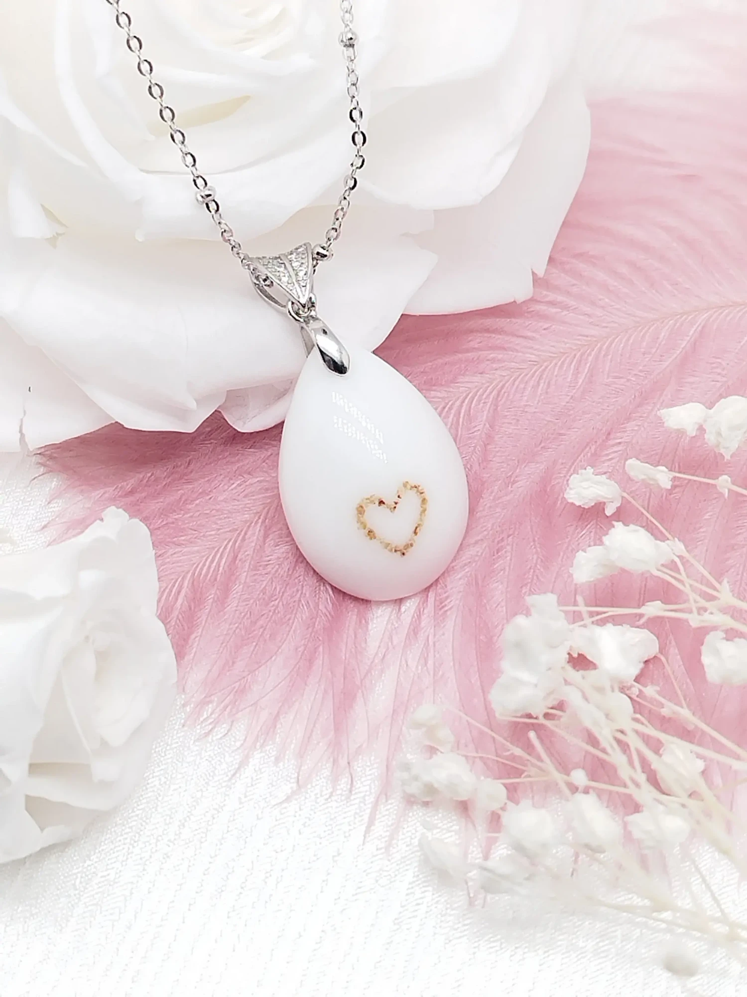 Notre collection signature présente une perle en verre contenant la poudre lactée compactée (déshydratation uniquement, sans résine). Le design minimaliste permet d’ajouter une mèche de cheveux ou des pétales de fleurs. Conçue pour un port quotidien avec soin, cette collection incarne l’élégance intemporelle et épurée.