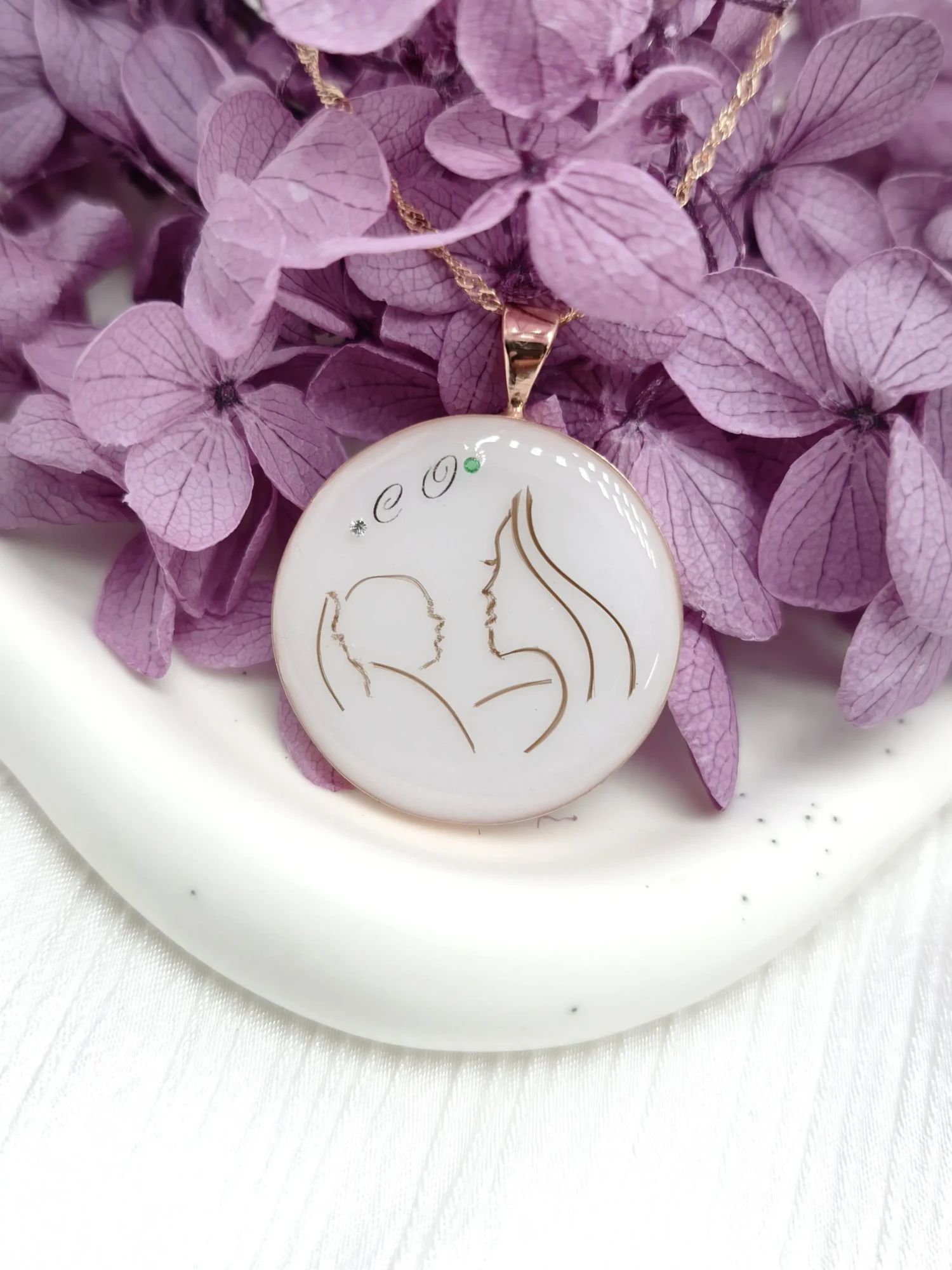 Créés en résine après le processus complet de préservation du lait maternel. Ces bijoux offrent une personnalisation maximale : mèches de cheveux, paillettes, feuilles d’or, cordon ombilical et multiples inclusions. Le rendu est artistique et travaillé, idéal comme bijou souvenir symbolique à porter lors d’occasions spéciales.