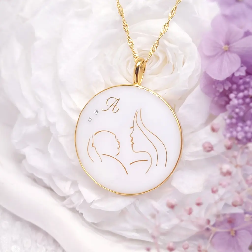 Ce médaillon raconte la plus belle des histoires : celle qui commence quand deux cœurs se reconnaissent pour la première fois. Ses courbes fines et épurées dessinent la tendresse de ce premier regard, la chaleur de ce premier contact, la douceur infinie de ce premier « je t’aime » qui n’a pas besoin de mots. C’est la symbiose parfaite, l’amour maternel sous sa forme la plus pure, la plus lumineuse.